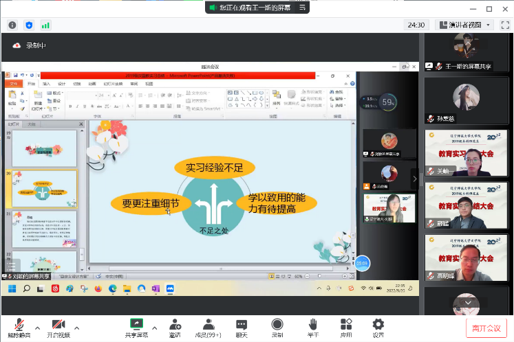 会议第二项,实习指导教师代表进行实习总结。关岫一老师从汉语言文学专业的角度,通过师德养成、教学实践、其他任务、反思与展望四部分进行总结汇报。她提到,教育工作不仅是教书,更要育人,一名教师应尊重并信任学生,关心学生的提高与成长。同时,关老师向同学们展示了实习生的日常工作内容,并鼓励大家集体备课,共同成长进步。